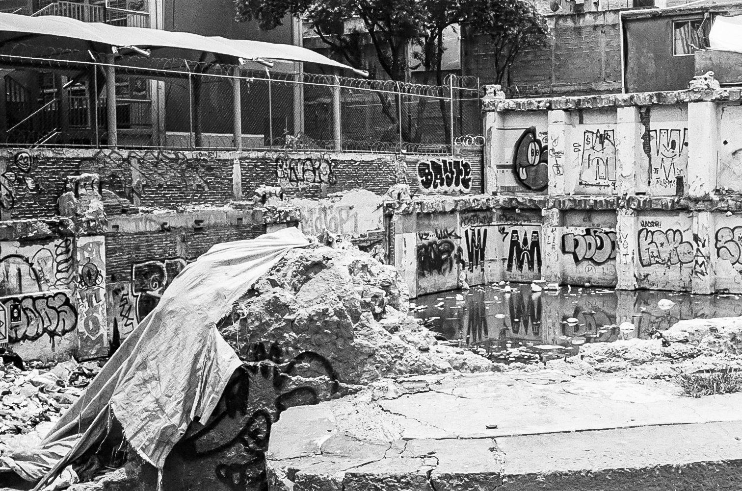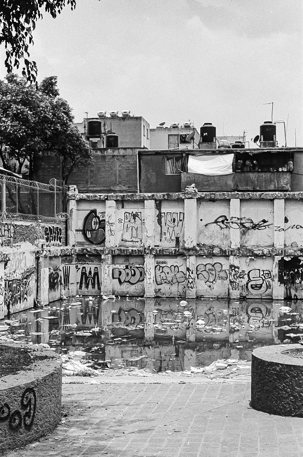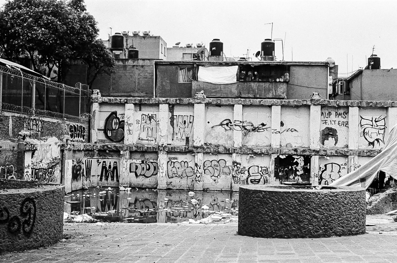 The Neighborhood Pool: Paseo de la Reforma x is a series of photographs that explores the current conditions of the vacant lot next to the historic La Lagunilla tianguis in Mexico City. This space, abandoned between 2019 and 2020, has become an open-air dump that floods every time it rains and serves as an improvised home for many homeless people.